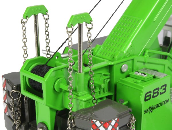 The 1:50th scale Sennebogen 683HD crawler crane was originally produced in a yellow and grey decoration with a limited edition turquoise version also produced. Ros made a good job on the development of the model and have now released a slightly updated version, finished in the Sennebogen Green colours. The model features a nicely detailed tracked undercarriage with individually linked metal tracks on extending frames. The track frames have rotating idler and drive wheels which are sprung to keep tension on the tracks which rotate well. The undercarriage casting includes front and rear mounted counterweights which have raised lifting eye detailing