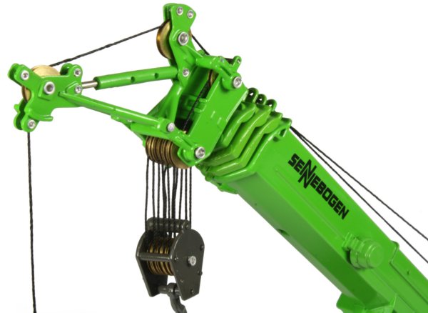 The rear of the model features two cable drums with the rear one used to raise/lower the main hook. The grey counterweights are cast as one piece but they do look like they are separate which gives the model a more realistic look. The addition of locking chains and the working counterweight lifting mechanism are an excellent tough and it is a shame that Ros chose to fix the counterweight in place. The Sennebogen name is embossed in the lower counterweight sections while the side sections have well defined red and white warning markings.