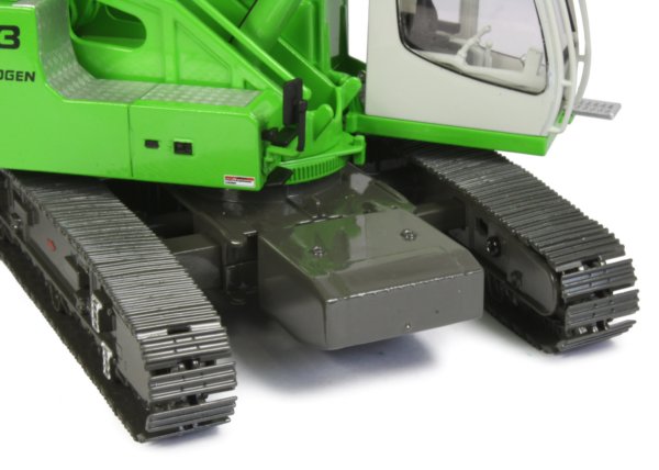 The 1:50th scale Sennebogen 683HD crawler crane was originally produced in a yellow and grey decoration with a limited edition turquoise version also produced. Ros made a good job on the development of the model and have now released a slightly updated version, finished in the Sennebogen Green colours. The model features a nicely detailed tracked undercarriage with individually linked metal tracks on extending frames. The track frames have rotating idler and drive wheels which are sprung to keep tension on the tracks which rotate well. The undercarriage casting includes front and rear mounted counterweights which have raised lifting eye detailing